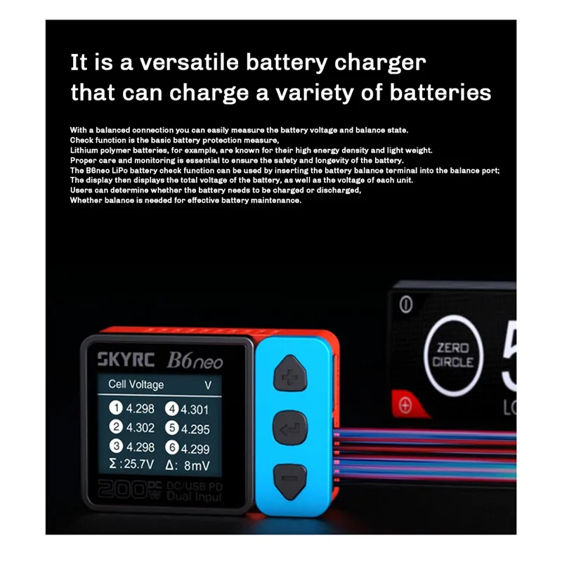 The SkyRC B6 Neo is a next-generation compact smart battery balance charger designed for FPV drone pilots, RC hobbyists, robotics engineers, and DIY electronics users. Despite its ultra-small size, the B6 Neo delivers up to 200W DC charging power and 80W USB-C PD fast charging, making it one of the most powerful chargers in its class.